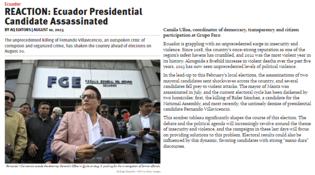Compartimos la entrevista de Camila Ulloa, en Americas Quarterly, donde se presenta la reacción sobre la muerte de Fernando Villavicencio, candidato a la presidencia en las elecciones anticipadas.