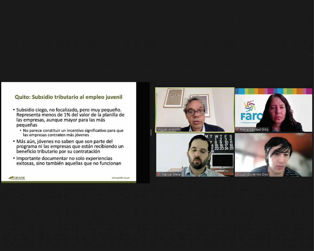 En el caso de Ecuador se habló del subsidio tributario al empleo juvenil. En la ponencia se destacó que los jóvenes no tienen mucho conocimiento del programa “Empleo Joven” implementado por el municipio de Quito y que el valor de subsidio no representa mayor descuento para las empresas, lo que no permite una apertura hacia nuevas contrataciones. Como principales recomendaciones es modificar la estructura del programa donde sea más integral, implementar estrategias de comunicación y posicionamiento del programa y diseñar un plan de evaluación y monitoreo del programa.